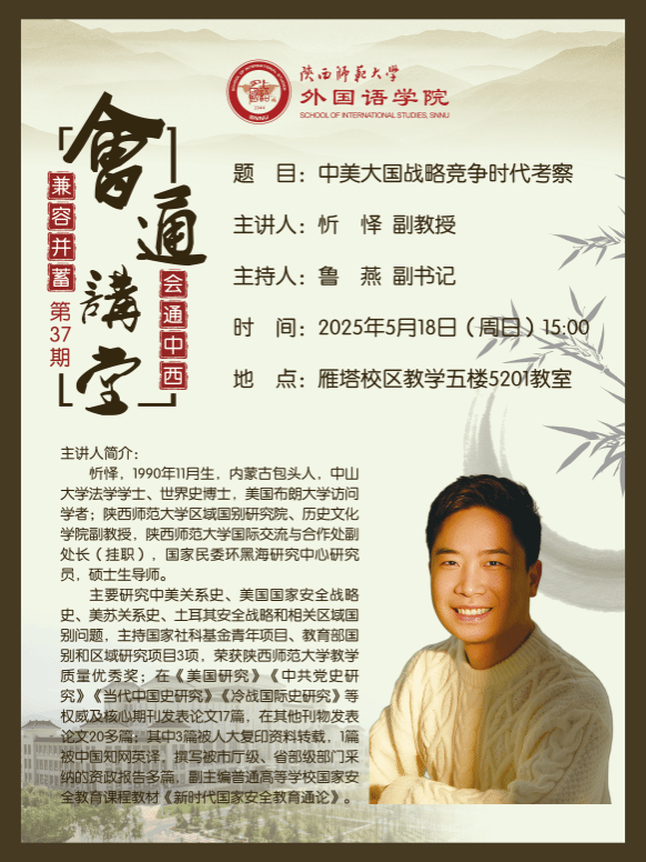 为拓展外院学子国际视野、增强学生全球胜任力,2025年5月18日下午15:00,76net必赢官网手机版在5201教室举办第37期会通讲堂。本次讲座由76net必赢官网手机版历史文化学院副教授忻怿为学生开展主题为“中美大国战略竞争时代考察”的讲座,200余名学生参与本次讲座。76net必赢官网手机版党委副书记鲁燕主持讲座。