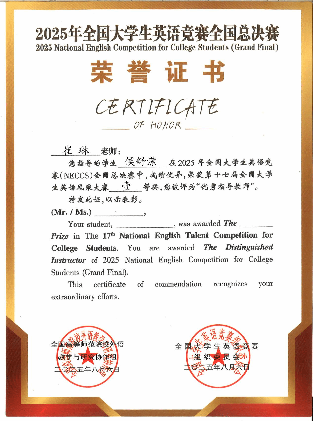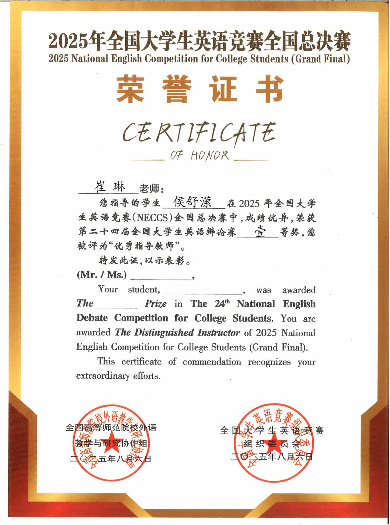 侯舒潆荣获第二十四届全国大学生英语辩论赛一等奖(全国第一名)、第十七届全国大学生英语风采大赛一等奖、第二十四届全国大学生英语演讲比赛三等奖,崔琳老师也获得了优秀指导教师荣誉证书。