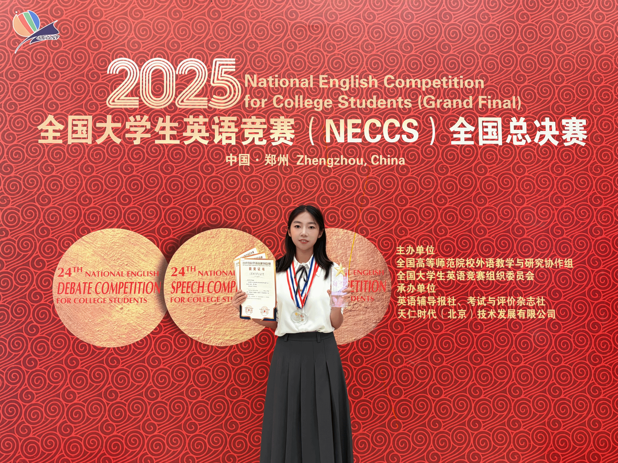 76net必赢官网手机版教师崔琳指导2023级马克思主义学院本科生侯舒潆参加2025年全国大学生英语竞赛(NECCS)总决赛的全部赛事,比赛中侯舒潆同学发挥出色,充分展现了我校大学英语课程思政教学的丰硕成果。