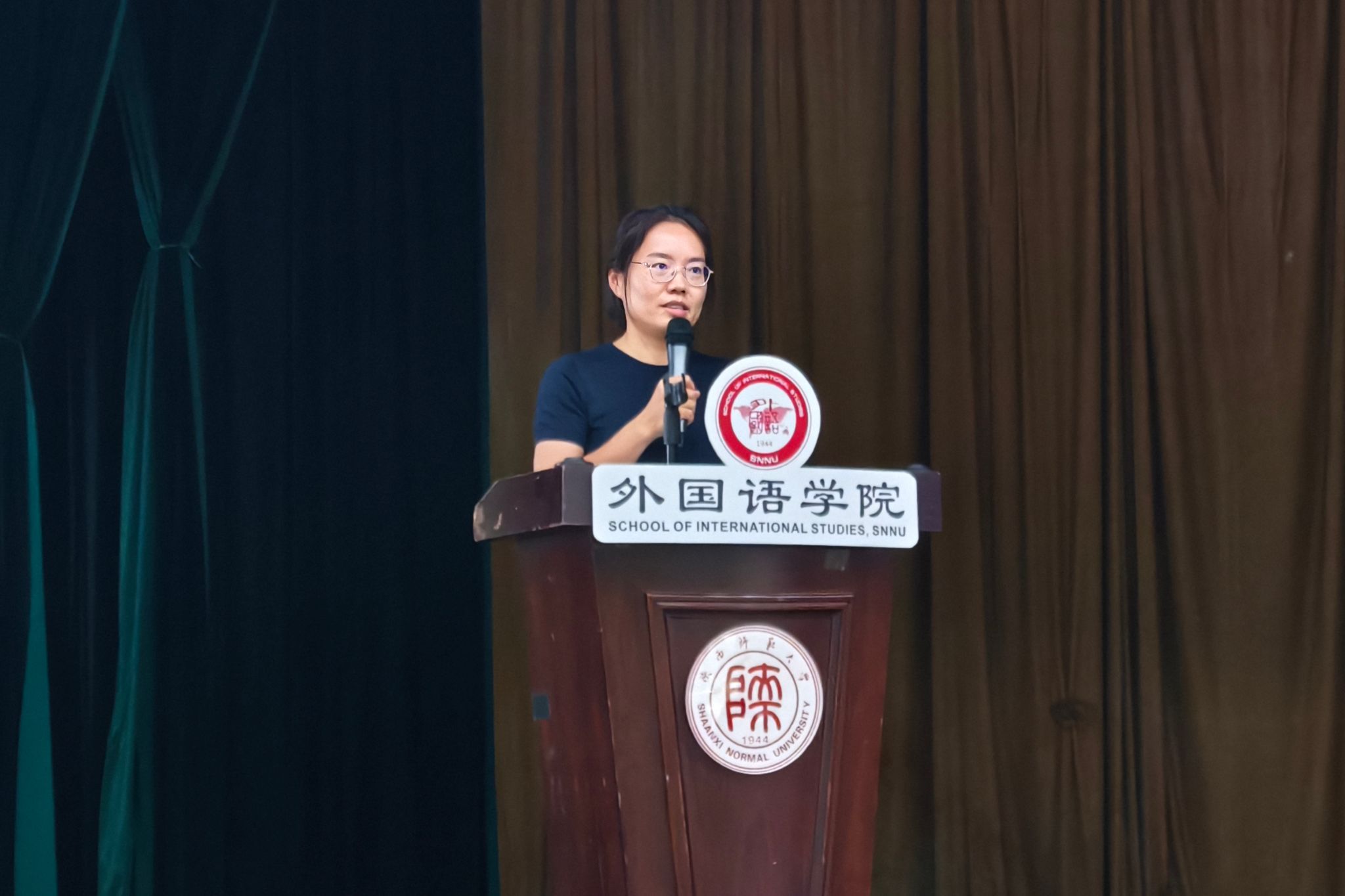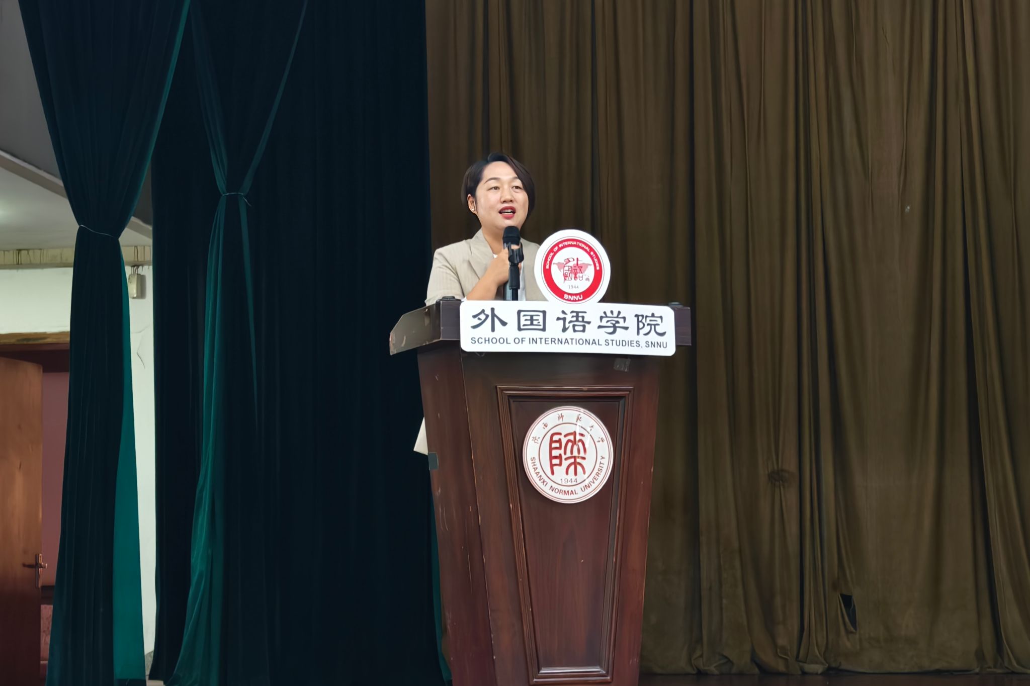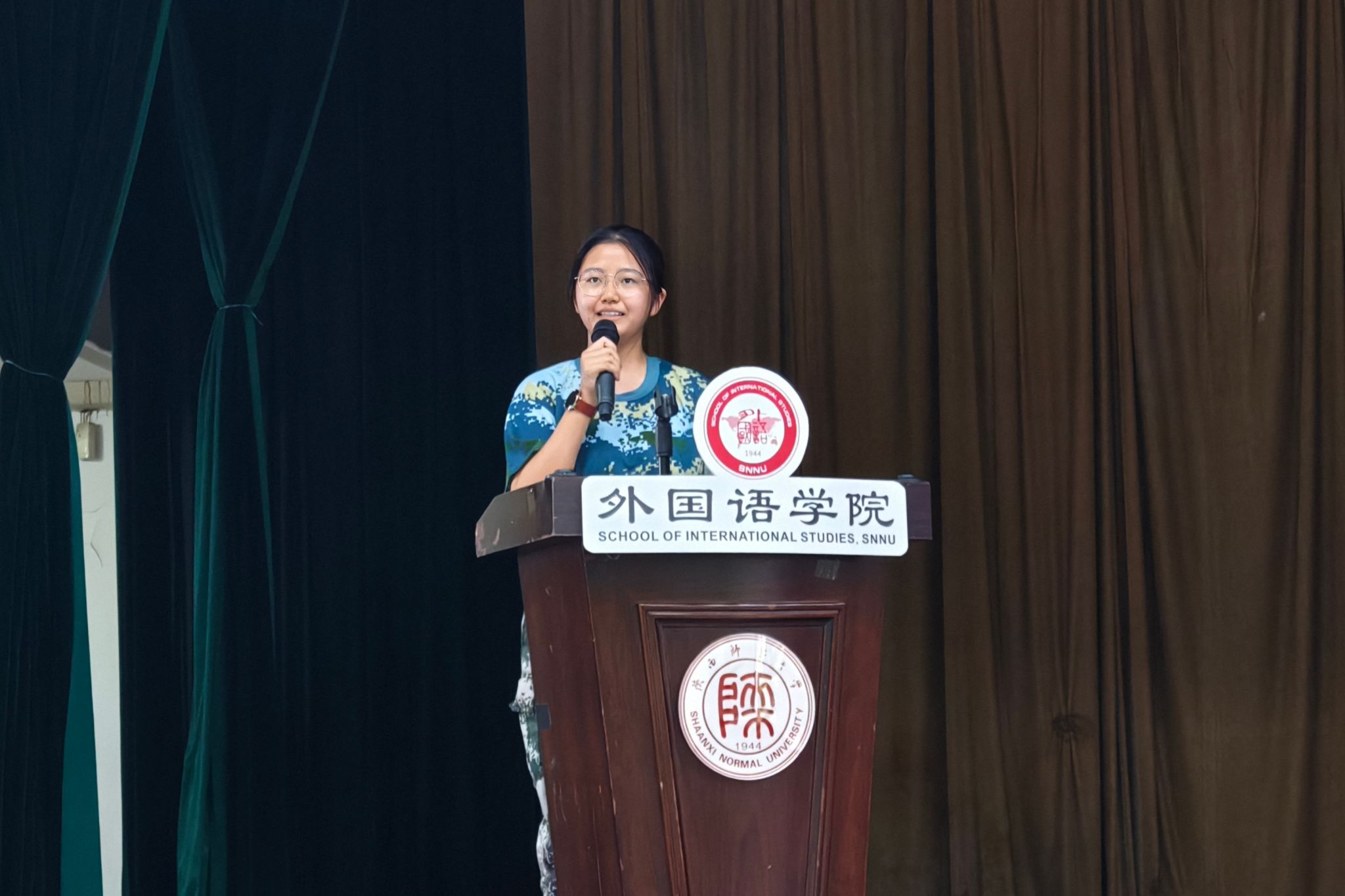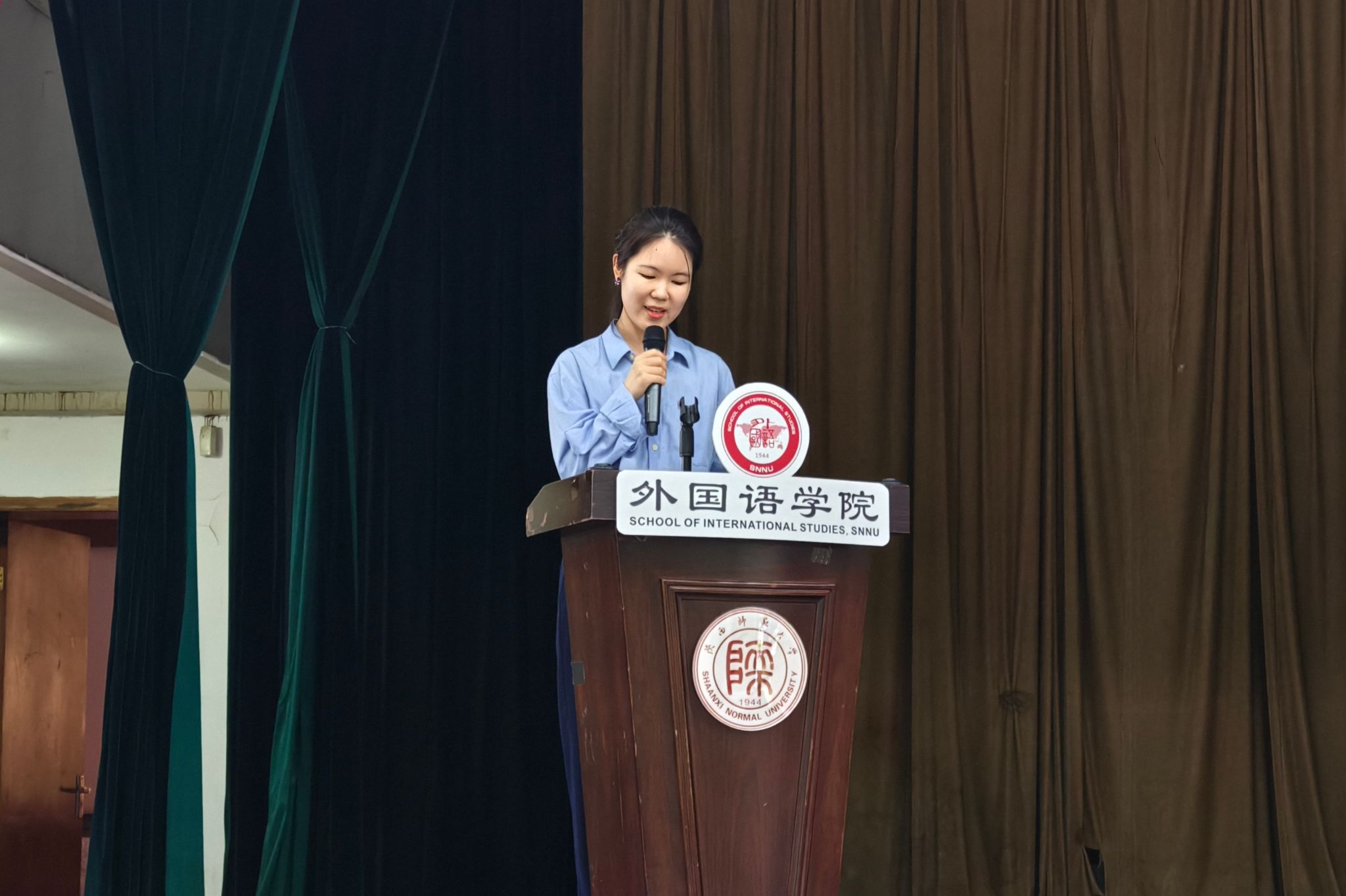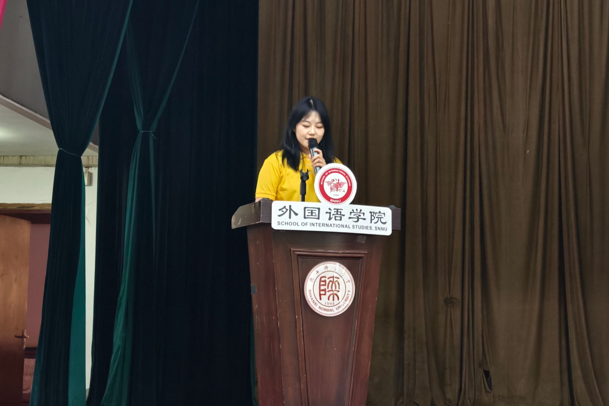 在校生代表2023级英语笔译专业硕士研究生贾婕发言。首先,她对来自五湖四海的新同学表示热烈欢迎和诚挚祝贺。其次,她以“明德知行、博识穷理、兼容并蓄、会通中西”的院训为主线,并结合学院“红色基因、家国情怀、国际视野”的育人特色,分享自己在师大六年的成长点滴。她鼓励新同学们铭记院训,勇于担当,以乐观之心、包容之心、感恩之心,在善待与尊重中收获友谊与成长!
