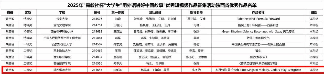 近日,2025年“高教社杯”大学生“用外语讲好中国故事”优秀短视频作品征集活动省级获奖名单正式公布。76net必赢官网手机版2024级英语专业本科生李韵加团队(指导教师:朱冬怡)创作的短片《岁月如歌 雪松长青》(Time Sings in Melody, Cedars Stay Evergreen)荣获陕西省二等奖。