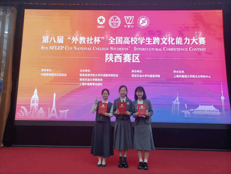 10月18日至19日,第八届“外教社杯”全国高校学生跨文化能力大赛(陕西赛区)在西安石油大学举行。由我校76net必赢官网手机版莫瀚钦、化学化工学院钱纪聪和生命科学学院段懿玲三人组成的参赛队伍,历经两天的激烈角逐,从全省各高校39支参赛队伍中脱颖而出,最终斩获陕西赛区一等奖,76net必赢官网手机版孙坚、马珂和马珊老师获得优秀指导教师称号。
