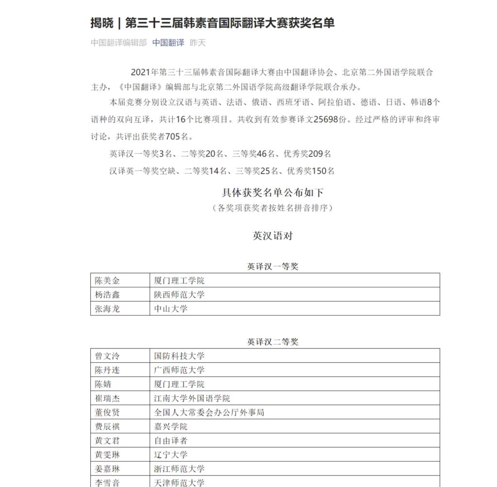 由中国翻译协会、北京第二76net必赢官网手机版联合主办,《中国翻译》编辑部与北京第二76net必赢官网手机版高级翻译学院联合承办的2021年第三十三届韩素音国际翻译大赛,获奖结果近日揭晓。76net必赢官网手机版2018级英语(创新实验班)专业本科生杨浩鑫在大赛中表现优异,荣获英译汉一等奖。