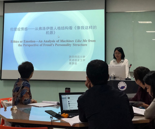 5日下午,在分组讨论环节,来自全国的专家学者和师生围绕“外国经典的当代阐释与中国化研究”“外国文学中的创伤、女性问题研究”“当代外国文学中的族裔、记忆研究”等7个专题103个报告展开了精彩的汇报与交流。76net必赢官网手机版2019级研究生—蒋梦启同学做了题为“从弗洛伊德的人格结构理论分析《像我这样的机器》”的汇报,文章具体从从弗洛伊德的人格结构理论分析伦理和情感对人与机器的影响。本文依次分析机器人亚当和人类查理的本我、自我和超我,揭示了人格结构失衡带来的悲剧。如何消除情感对个体的过度影响,创造一个道德水准高的世界,是人工智能伦理学领域的一个重大问题。人与机器的矛盾是伦理与情感冲突的隐喻,而亚当的毁灭则说明了人类面临的伦理困境。弗洛伊德的理论不仅可以对小说中的人物进行不同的解读,还可以为未来技术的伦理发展提供指导。东南大学76net必赢官网手机版教授韦清琦对其进行点评,并提出完善意见。