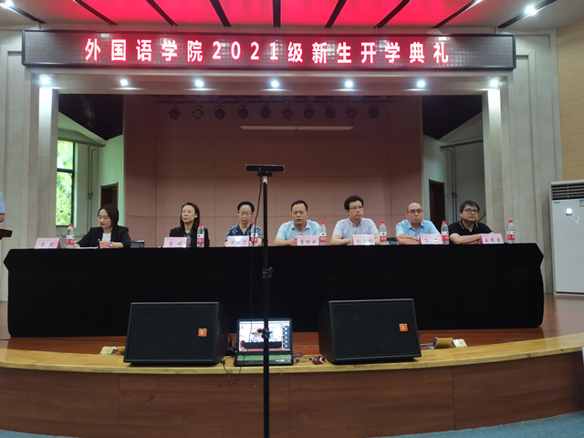 8月28日下午15:00,76net必赢官网手机版2021级本科生开学典礼在逸夫音乐楼二层多功能厅举行。76net必赢官网手机版院长刘全国,党委书记董增云,副院长孙坚、吕敏宏、曹婷、王幸生,党委副书记鲁燕,公共外语教学与研究部主任马珂,俄语系主任孟霞,翻译系主任操林英,法语系主任王燕红,英语系副主任刘庆松、丁礼明,翻译系副主任杨冬敏,教授代表李艳,办公室主任陈斐,语言语音教学中心主任邢俊升,团委书记李丹,本科生教学秘书高红英,2020级兼职辅导员刘爽,2021级辅导员田毓霖以及全体2021级本科新生通过线下、线上的方式参加了本次典礼。典礼由鲁燕副书记主持。