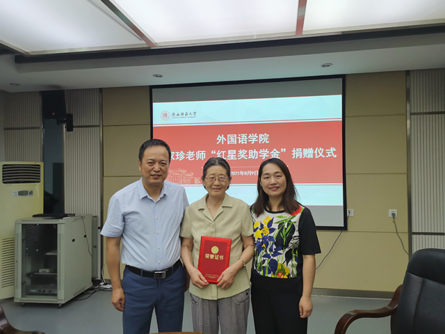 8月9日上午10点,76net必赢官网手机版在雁塔校区学院会议室举行了退休教师钟家珍“红星奖助学金”捐赠仪式。钟家珍老师及学院党委书记董增云、党委副书记鲁燕、辅导员李丹参加了捐赠仪式。