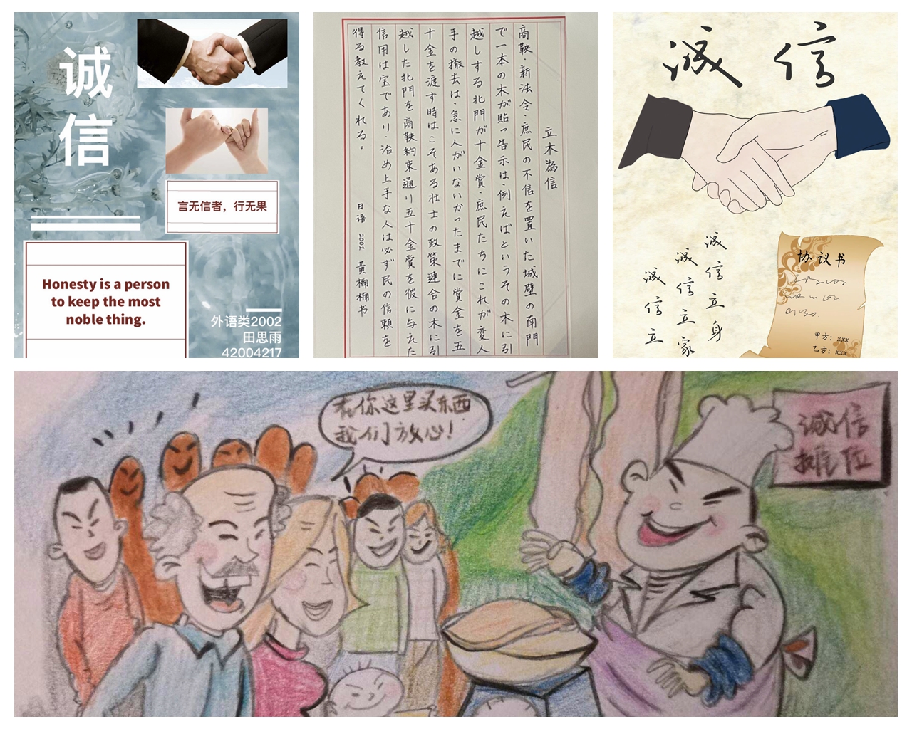 结合同学们的专业优势和个人特长,76net必赢官网手机版面向全体本科生举办诚信主题作品征集活动,拍摄微视频《诚信》讲述校园中“拾金不昧”的诚信故事——经过筛选评比,最终遴选出优秀诚信主题征文5篇,书法作品7件,手抄报绘画作品6件,主题微视频短剧1部。征文作品字里行间体现出同学们对于诚信的崇尚与呼吁,硬笔书法刚劲有力,绘画海报生动形象,短剧视频见微知著。相关优秀主题作品还在学院“语心阁”宣传展板进行展览,吸引了众多学生们前来观看。学院也通过“外院见闻”官方微信,进一步对于诚信教育优秀主题作品进行宣传展示。