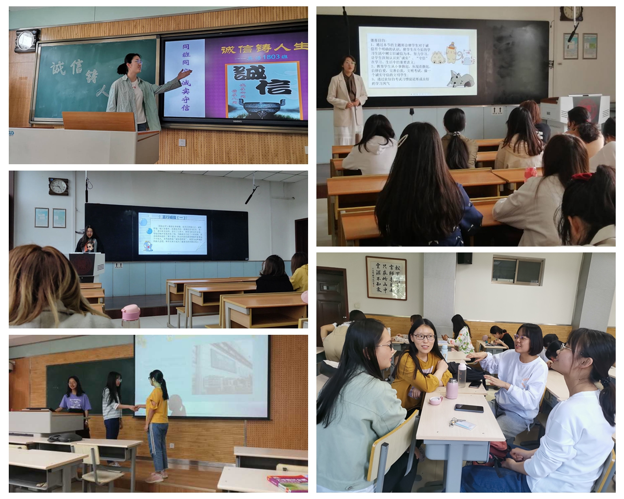 76net必赢官网手机版2020级、2018级各班陆续开展了以“诚信教育”为主题的班会活动。班会形式包括诚信精神解读、典型案例分享、情景剧表演、互动交流总结等环节,同学们结合日常生活中遇到的诚信事件,学习诚信的基本内容,分享典型的诚信事件,学习先进人物的先进事迹,并且以情景剧的方式演绎失信的后果,警醒同学们懂得诚信是一个人的立身之本,认识到失信的危害,并将班会中所感所学,自觉应用到实践中去.班会活动旨在培养学生诚实待人、守信做人的优良品质,共同营造出“知信、用信、守信”的良好氛围。此外,结合学生即将迎接的考试进行考试诚信教育,使学生不仅在日常点滴生活中做到信守承诺,引导同学们共同宣誓承诺在接下来的专业四级、教师资格证等考试中,发扬诚信考试的精神,勤勤恳恳学习、规规矩矩考试、踏踏实实做人。