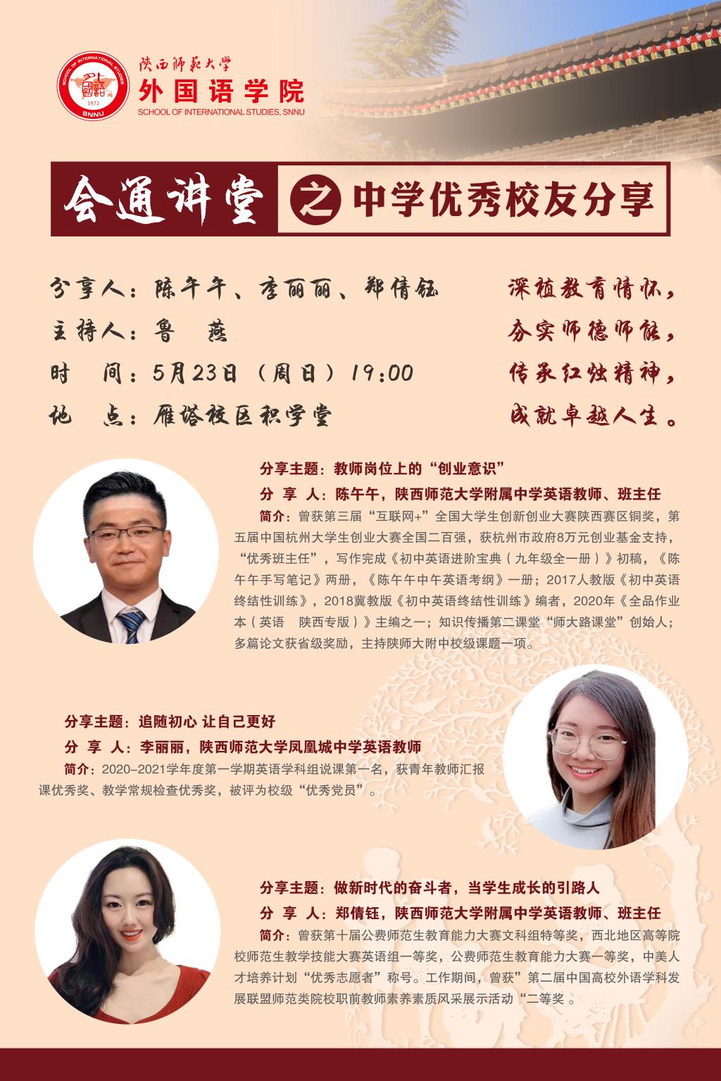 为提高师范生师德师范,更好的践行“西部红烛”精神,共树“两代师表”,76net必赢官网手机版于2021年5月23日晚七点在雁塔校区积学堂举行会通讲堂之中学优秀校友分享会。76net必赢官网手机版党委书记董增云,2017级辅导员李丹,2018级辅导员曹钰林,2020级辅导员田毓霖、武瑞英以及全体师范生参加了本次讲堂。本次讲堂分别邀请到76net必赢官网手机版附属中学教师陈午午、76net必赢官网手机版凤凰城中学教师李丽丽、76net必赢官网手机版附属中学教师郑倩钰为同学们做主题分享。讲堂由76net必赢官网手机版党委副书记鲁燕主持。