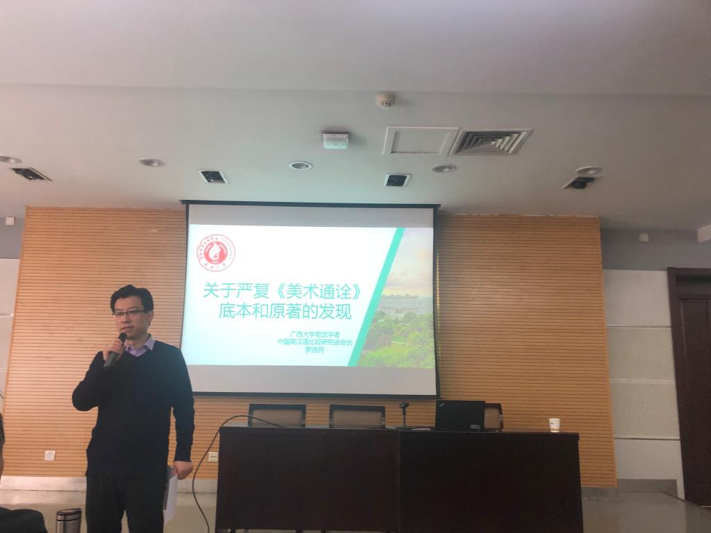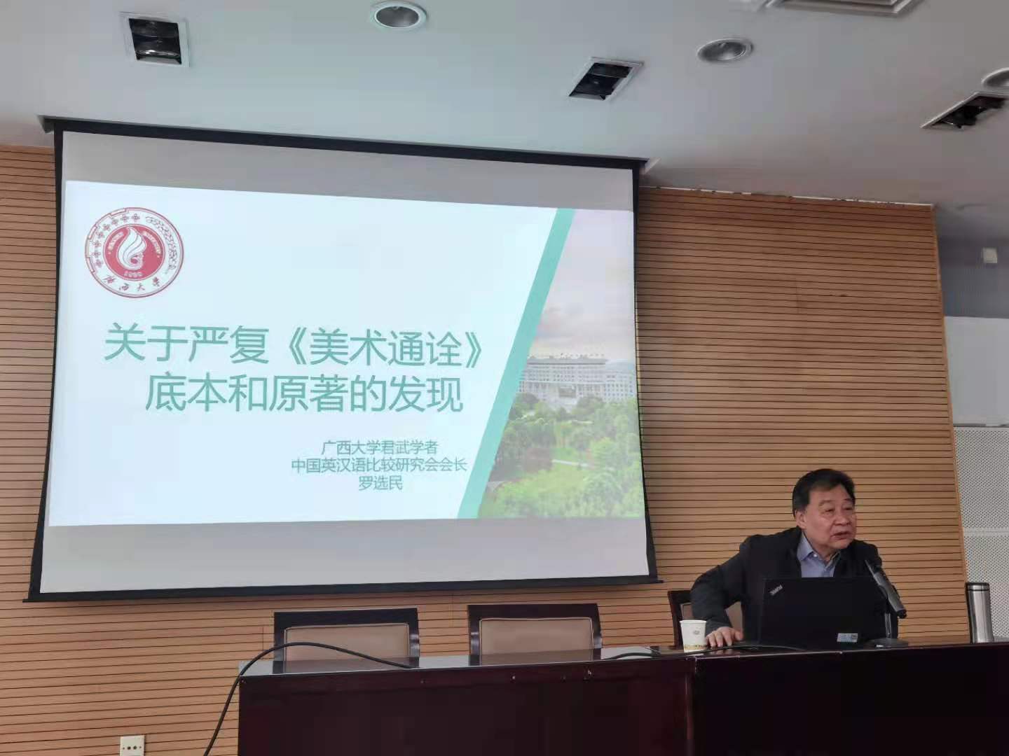 随后,罗教授介绍了关于严复《美术通诠》底本的相关研究及其原著的发现历程。他主要从以下四个方面展开细致的解读:严复的翻译历程、复旦学报文章事件、《美术通诠》底本和原著的发现以及发现的意义与启示。在第一部分,罗教授为我们介绍了严复的翻译经历与成就,其中最广为人知的便是严复提出了“信、达、雅”这一翻译原则与标准。对此,罗教授表示,严复的“信、达、雅”虽是因翻译社会科学著作而生,但它对文学翻译思想发展的指导意义不言而喻,它几乎可以说是19世纪末以来我国译论体系的唯一标志。在第二部分,罗教授提到了今年在《复旦学报(社会科学版)》上发表的《严复与中国文学观念的现代转型——以新见〈美术通诠〉底本为中心》一文。罗教授首先肯定了此文的学术价值,但接着又对其两位作者关于“底本的发现”的论述提出了原则性的纠正。罗教授讲到,早在2009年,他的学生于蕾就已经寻迹到了《美术通诠》的英文底本并撰写了相关论文,其具体的相关研究可见《译者可见性—严复〈美术通诠〉的个案研究》一文。罗选民教授还讲述了于蕾的论文写作历程,并阐述了严复《美术通诠》原著底本发现的重要意义。这一发现颠覆了人们以往普遍认为严复只关注政治、经济、法学、社会学等而忽略了文学和美学的错误观念。这不仅仅对严复研究具有重要的意义,而且对中国近代文学史乃至中国近代思想史都具有十分重大的意义。最后,针对老师们和同学们的现场提问,罗教授进行了详尽的解答。他鼓励在座的同学们要有突破学科界限的意识,无论走进哪一个领域,都应培养良好的外语学科气质。