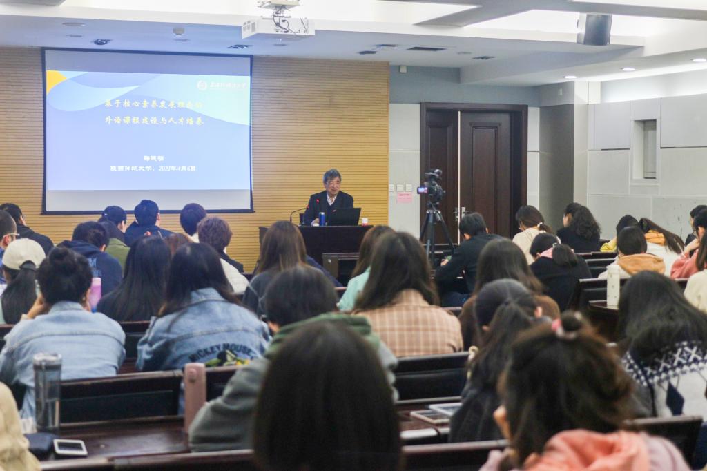 2021年4月6日下午,76net必赢官网手机版第一百三十一场著名学者系列讲座《基于核心素养发展理念的外语课程建设与人才培养》在雁塔校区崇鋈楼闻道堂成功举办。上海外国语大学梅德明教授受邀担任主讲人,我校76net必赢官网手机版副院长刘全国教授担任主持人。76net必赢官网手机版全体研究生参与并认真聆听了此次讲座。