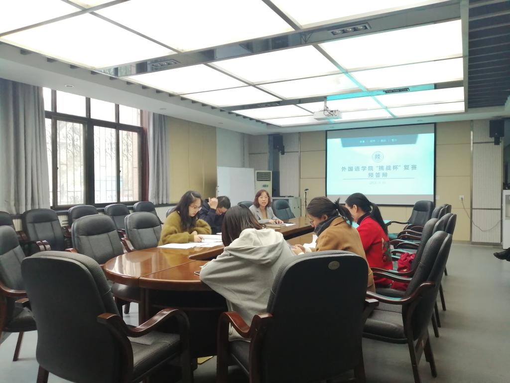 为积极准备复赛,5支参赛队伍于3月11日下午学院会议室进行了复赛预答辩,英语系副主任丁礼明、俄语系教师段李敏、翻译系教师巢玥、研究生辅导员董洁、2017级辅导员李丹、2019级辅导员屈婉婷担任了此次预答辩的评委,预答辩由分团委书记高芳卉主持。入围学校复赛的五组作品负责人依次通过PPT的形式,从选题背景及原因、调研过程、调研成果、论文概述等方面对自己的项目进行了简要汇报。评委老师指出了作品存在的主要问题,并提出了指导性的意见和建议。