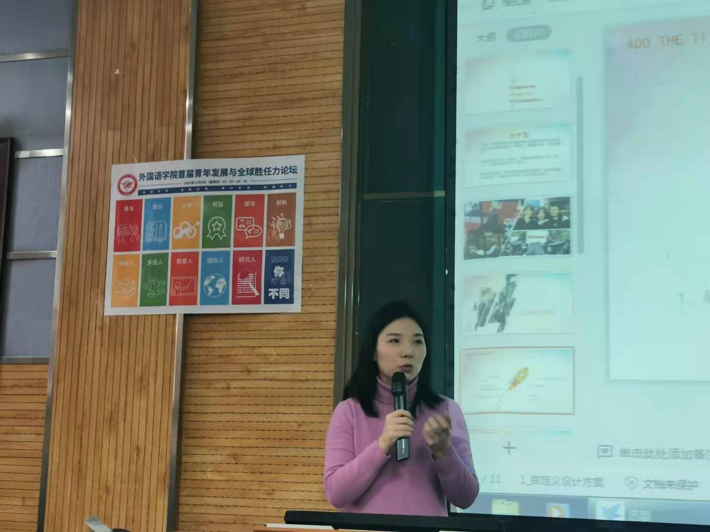 首先,由英语系陈蕾老师做主题报告“我的求学之路”。陈蕾老师分享了自身的求学历程和留学经历,鼓励外语学生开拓视野、不负韶华、勇敢逐梦。接着,马克思主义学院十九届五中全会宣讲团成员漆佳意、陈华飞两位同学分别从“如果信仰有颜色”“弘扬西部红烛精神,推进义务教育均衡发展”进行主题宣讲。