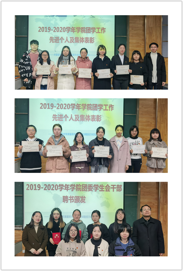 最后,学院领导进行年度团学工作表彰并发表总结讲话。党委副书记鲁燕以“基础、平台、理性、有恒”四个关键词要求学生骨干要充分利用好学院、学校为同学们搭建的各种平台,持之以恒,不断提升自己的专业能力的同时,作为外语学子更要不断提高自身基于民族精神的国际交流能力、自我学习规划能力以及国际团队合作能力。党委书记马正平指出,十九届五中全会提出了到2035年要实现的远景目标,同时也提出了更高的要求,高质量的发展更加需要高质量的人才,师大学子作为“国家队”的一员,要砥砺品德、夯实基础、明确目标,从解决问题出发创新,通过不断学习提升自己的创新本领,争做与一流大学相匹配的一流学生。