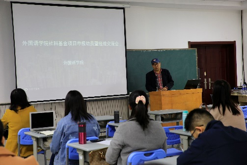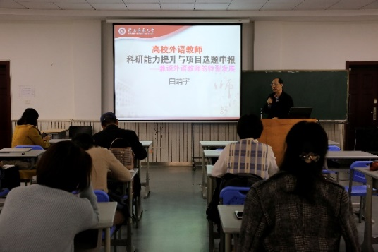 最后白靖宇教授作了关于科研能力提升与项目选题申报的报告。他具体分析了外语学科各个学科的特点,以及外语学科研究中存在的困难,指出外语学科教师应该拓展学科知识,逐渐尝试学科转向及身份转型,克服困境,不断提升科研能力。