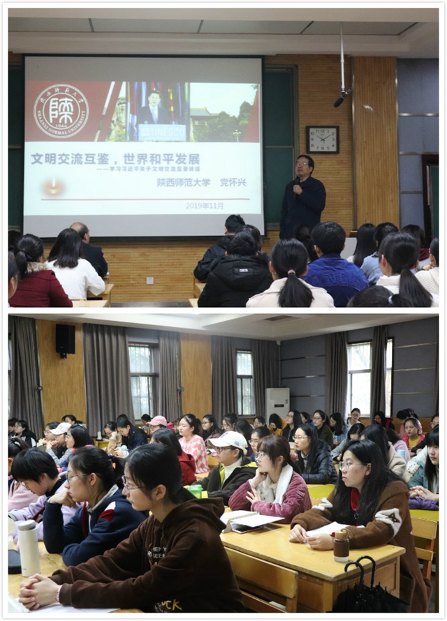 为进一步深入学习贯彻习近平新时代中国特色社会主义思想,结合“不忘初心,牢记使命”主题教育要求,2019年11月1日上午,76net必赢官网手机版邀请副校长党怀兴在雁塔校区5301教室向76net必赢官网手机版学生讲授了一堂生动的思政课,主题为“文明交流互鉴,世界和平发展---学习习近平关于文明交流互鉴讲话”。学院党委书记马正平、副院长孙坚、副书记鲁燕、辅导员李丹、屈婉婷及学生150余人聆听了课程。