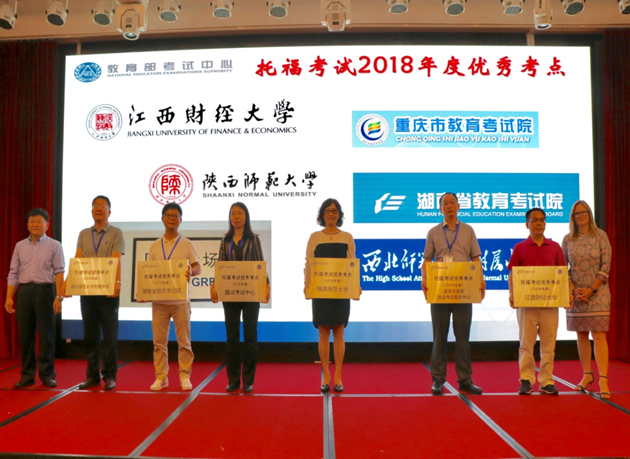 最后,举行了优秀考点颁奖仪式。包括我校在内的21个考点从全国140多个考点中脱颖而出,获得了“2018年度优秀考点”称号,这也是教育部考试中心自2006年开考以来首次颁奖。我校托福考点于2012年7月开始投入使用,共承接了三百余场考试,接待考生近两万人次。在学校各级领导的支持下,经过所有考务人员的不懈努力,逐步改进考务流程、完善考场设施、提高考务水平,实现了考试安全零失误,在考试中心的多次巡视评估中获得了优秀成绩。