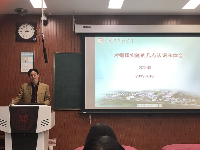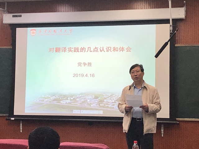 “新时代背景下如何成为一名更好的译者,传播好中国文化,讲好中国故事,如何更好地提高翻译水平”,这是值得每一位翻译工作者思考的问题,2019年4月16日19:00-21:00,在我校雁塔校区4101教室,西安外国语大学副校长党争胜教授通过题为“对翻译实践的几点认识和体会”的学术讲演,与76net必赢官网手机版师生分享了他对翻译实践的认识和体会,结合自己扎实的翻译理论素养和丰富翻译实践经验,引导在场翻译硕士和翻译系本科生进行了思考。本场讲座是由76net必赢官网手机版MTI中心主办的“翻译实务系列讲座”第七讲。76net必赢官网手机版院长王启龙教授主持讲座,76net必赢官网手机版多名教师、翻译专业硕士生及本科生聆听了此次讲座。