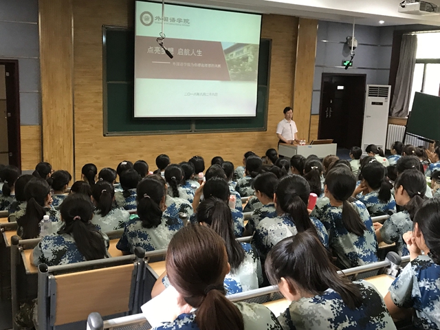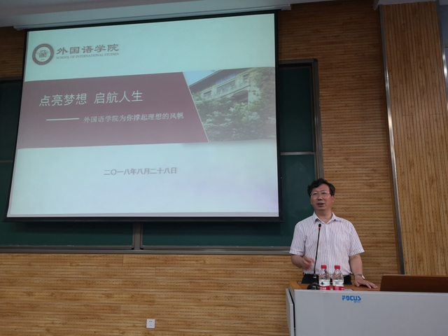 王院长首先代表学院全体教职工热烈欢迎新同学的到来。随后他从学科设置和教学改革方向为新生介绍了学院的概况,并与大家分享了自己的人生经历。王院长谈到,在学习上要踏实刻苦,在不折不扣做学问的同时,要注重培养独立思考的能力和习惯;早日开展学业生涯规划,树立远大目标,沿着既定的人生规划,一步一个脚印,让理想从每一天的脚踏实地中实现;充分利用好语言工具,把外语当做一扇窗户或钥匙,树立国际视野,在国际舞台、国内高校、基础教育战线及各行各业中绽放光彩。