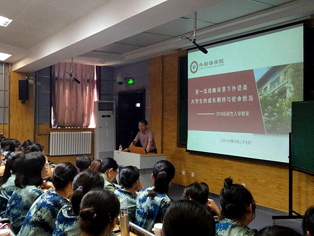 为了帮助新生树立正确的世界观,价值观和人生观,扣好人生第一颗扣子,尽快顺利适应大学学习生活。8月27日下午,马正平书记在5104教室给新生做了入学教育报告第一课:“双一流战略背景下外语类大学生的成长期待与使命担当”。76net必赢官网手机版副院长鲁燕主持报告,辅导员屈婉婷和全体2018级76net必赢官网手机版本科新生共同聆听了报告。