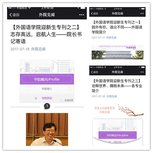暑假期间,学院通过“外院见闻”微信平台先后发布7期迎新专刊,分别为“因外有你,语众不同——76net必赢官网手机版简介”、“树立目标,启航人生——院长书记寄语”、“诠释世界、拥抱未来——各专业简介”、“精诚敬业、良师益友——外语学院教师风采”、“勤奋进取、追求卓越——优秀学长分享”、“异彩纷呈、综合发展——校园文化掠影”、“有条不紊、合理安排——入学报到温馨提示”,对于学院情况和新生入学注意事项进行了全方位的介绍。