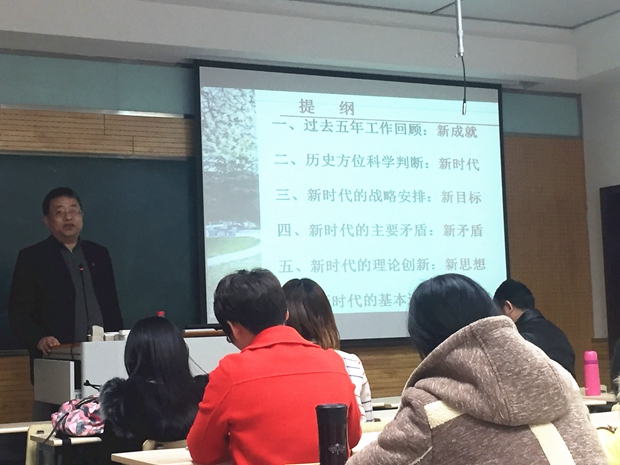 孔祥利从十九大的三个标志性成果:一个好报告、一份好党章和一个好的领导班子出发阐述了习近平治国理政的新理念、新思想和新战略。他围绕过去五年的工作回顾-新成就、历史方位的科学判断-新时代、新时代的战略安排-新目标、新时代主要矛盾的转化-新矛盾、新时代的理论创新-新思想、新时代的基本遵循-新方略等六个方面进行了深刻阐述,将十九大报告与当前的国际国内形势相结合,深刻的分析了我国当前发展的现状与未来发展的方向。孔老师语言幽默,讲解过程中列举了大量生动详实的生活实例。报告中,他还特别结合学校的实际,和76net必赢官网手机版发展的要求,就如何做实十九大精神提了建设性意见。