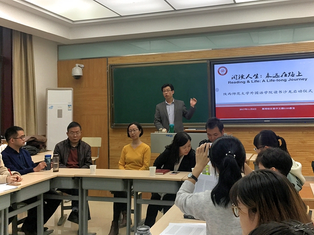 2017年11月8日下午,76net必赢官网手机版“阅读人生:永远在路上 (Reading & Life: A Life-long Journey)”读书沙龙启动仪式暨首场分享会在雁塔校区教学五楼5103教室顺利开展。启动仪式由76net必赢官网手机版英语系主任吕敏宏老师主持,副院长刘全国老师、英语系副主任刘庆松、王立永老师,张亚婷教授、教学秘书马维华老师和2016级辅导员卢婉莹老师出席了本次活动。