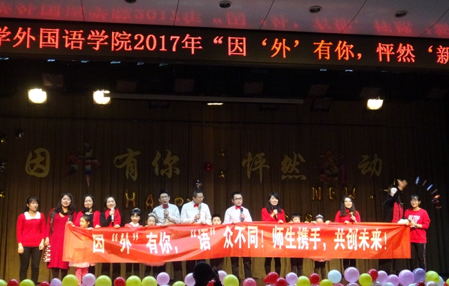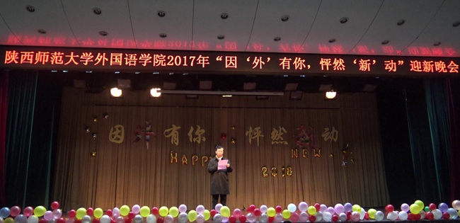 为迎接2017级新生暨2018新年的到来,展现外院莘莘学子的风采,2017年12月23日晚7点,76net必赢官网手机版全院师生欢聚一堂,在雁塔校区积学堂隆重举行“因外有你,怦然新动”迎新晚会。76net必赢官网手机版院长王启龙,党委书记马正平,副院长刘全国、鲁燕,英语系主任吕敏宏、副主任王立永,俄语系主任孟霞,翻译系副主任杨冬敏,团委书记高芳卉,2014级辅导员行怀春、2015级辅导员董洁、2016级辅导员卢婉莹、王浩权、2017级辅导员李丹以及各系外籍教师等莅临本次迎新晚会。