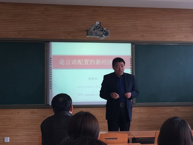 2018年3月19日下午2:30分,对外经济贸易大学惠园杰出学者、教育部全国大学外语教学指导委员会副主任委员向明友教授莅临76net必赢官网手机版雁塔校区,进行了一场题为《论言语配置的新经济原则》的讲座。此次讲座由76net必赢官网手机版院长王启龙教授主持。76net必赢官网手机版师生共同聆听了此次精彩的学术讲座。