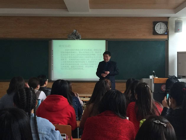 首先,王启龙院长向在场听众介绍了向明友教授,随后讲座在一阵热烈的掌声中开始。向教授以讲故事的方式引入,将经济学知识与语言学相结合,提出了独特的语用原则——言语配置的新经济原则。本报告在理清言语交际机制,澄清言语交际功能的基础上,修正传统语言学、修辞学及语用学学者对言语经济性的静态理解,在语用层面上将传统的经济语言重新界定为:经过优化配置、实现效用最大化的言语。在认识支配言语配置的基本规律的前提下,构拟指导言语优化配置的新经济原则,该原则由言语配置的一般均衡准则、前提共识准则、择近准则、从众准则以及言语生效准则构成。整个过程中,向教授语言诙谐幽默,使大家在轻松愉悦的氛围中领略了学术奥秘。