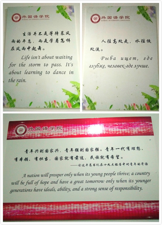 为了加强学生的思想政治教育,营造学生生活区的专业氛围,一方面,学院在学生宿舍走廊精心设计了以习近平总书记青年寄语和社会主义核心价值观为主要内容的展板。另一方面,结合专业特色和专业分布布置了中国传统文化及各国名言警句展板。所有内容均以中外文对照形式呈现,在引导学生加强思想认识的同时,帮助其树立文化自信,提升跨文化交际能力。展板覆盖76net必赢官网手机版学生所在的公寓三楼和学生宿舍六楼,共计136块。