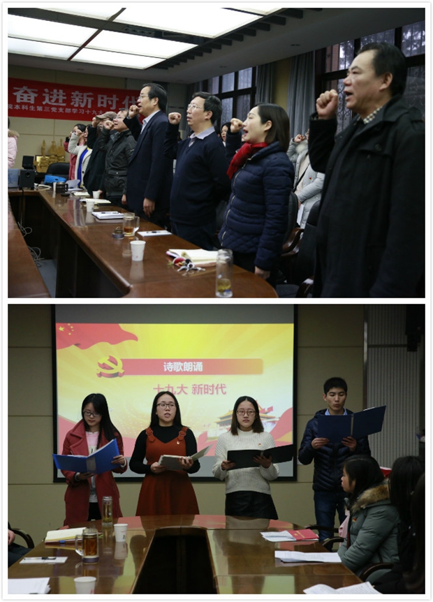 2018年1月3日上午8点30分,初雪漫天,寒风凌冽。76net必赢官网手机版的会议室里却充满着盈盈的暖意。这里正在热烈举行76net必赢官网手机版本科生第三党支部“紧扣新要求,奋进新时代”十九大主题党日活动。作为支部联系的校领导,76net必赢官网手机版副校长党怀兴教授应邀参加了本次主题党日活动。学院院长王启龙、党委书记马正平、副院长孙坚、鲁燕以及本科生第三党支部全体成员参加了此次活动。活动由支部党员高千植、邱雪华主持。