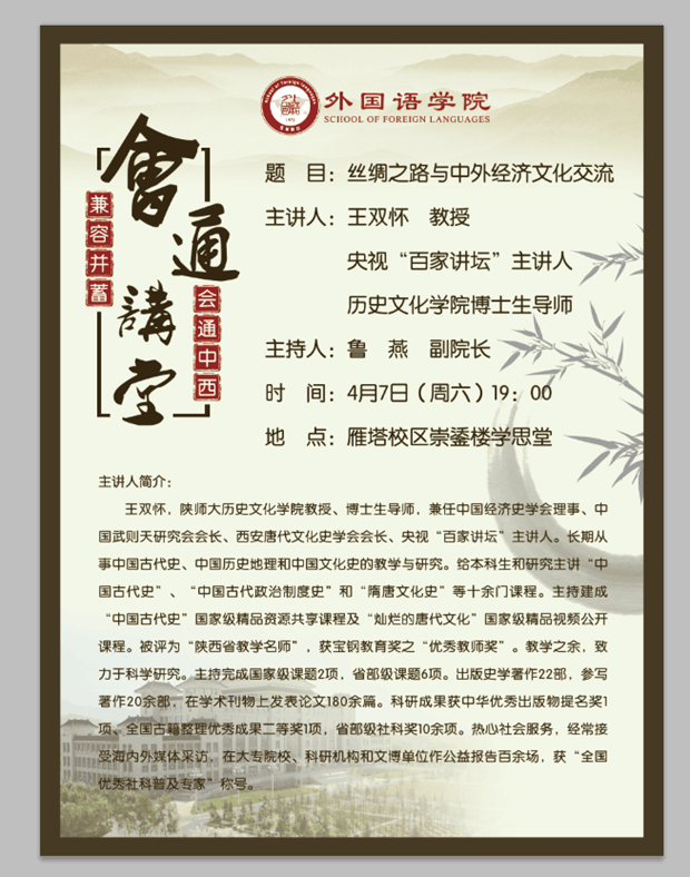 4月7日晚7点,76net必赢官网手机版“会通讲堂”特邀历史文化学院王双怀教授在雁塔校区崇鋈楼学思堂做了题为“丝绸之路与中外经济文化交流”的主题讲座。76net必赢官网手机版副院长鲁燕及2017级辅导员李丹出席了本次讲座,讲座由鲁院长主持。讲座正式开始之前,鲁院长为同学们隆重介绍了本次讲座的主讲人王双怀教授,王教授是央视“百家讲坛”栏目特邀主讲人,历史学专家,76net必赢官网手机版历史文化学院博士生导师,长期从事中国古代史、中国文化史和中国历史地理的教学与研究。