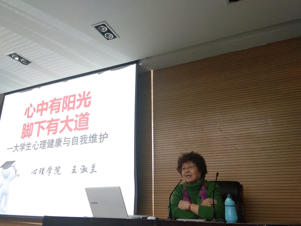 随后,报告正式开始。王淑兰教授幽默风趣,亲切和蔼,她指出大学生心理健康十分重要,并着重从理解心理健康、维护和增强大学生心理健康是当代大学生的必修课、心理健康的大学生必备的10项心理品质、如何对心理健康进行自我维护等4个大的方面进行讲解。她一一讲解了当代大学生应该具备的10项心理品质,分别为智力健全,有较理性的思维方式;学习态度积极,并能胜任学习任务;情绪健全,有较高的情商;意志健全,做事有目标和坚持性;性格健全,开朗、乐观、有责任心和自律性;自我意识健全,能悦纳自我;有理想和积极的价值观;喜欢与人交往,人际关系融洽;行为正常,符合年龄特征和社会规范;有基本的社会适应能力和心理承受力。她强调,只有具备以上素质并积极面对困难才能高质量地完成大学的学业及生活。她还鼓励大学生应当树立科学健康的观念;积极学习心理健康的有关知识,以平和的心态面对压力;及时了解自己的心理健康状况,学会运用心理学对策帮助自己走出心理困境。