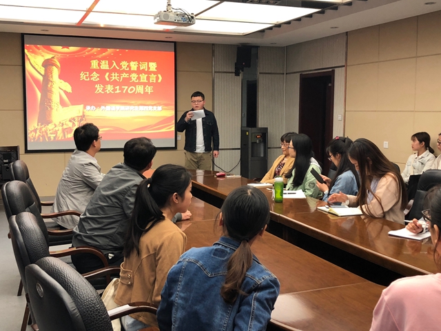 4月24日下午4点30分,76net必赢官网手机版研究生第四党支部在76net必赢官网手机版会议室组织召开以“重温入党誓词暨纪念《共产党宣言》发表170周年”为主题的党日活动。学院党委书记马正平、副院长刘全国、副书记马兰及部分师生党员代表参加此次党日活动。此次党日活动由研究生第四党支部党员吉宇主持。