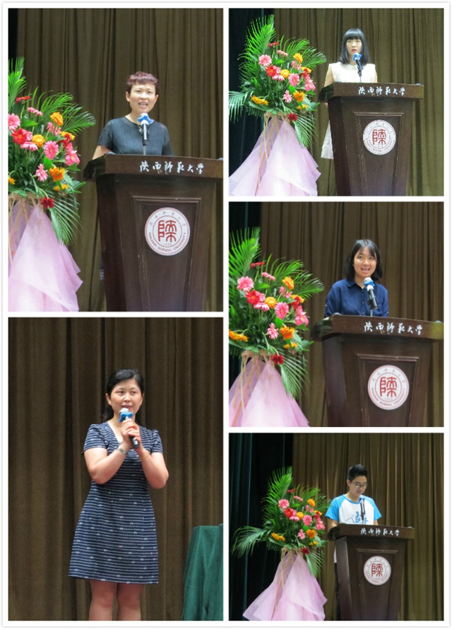 随后,家长代表2014级英语创新实验班王裔迪同学的母亲刘少华女士发言。她首先对学校和学院以及全体老师表示了感谢,并分享了“赢”和“舒”两字的内涵与价值,鼓励毕业生们无论工作在什么岗位,都要创造价值,服务社会。