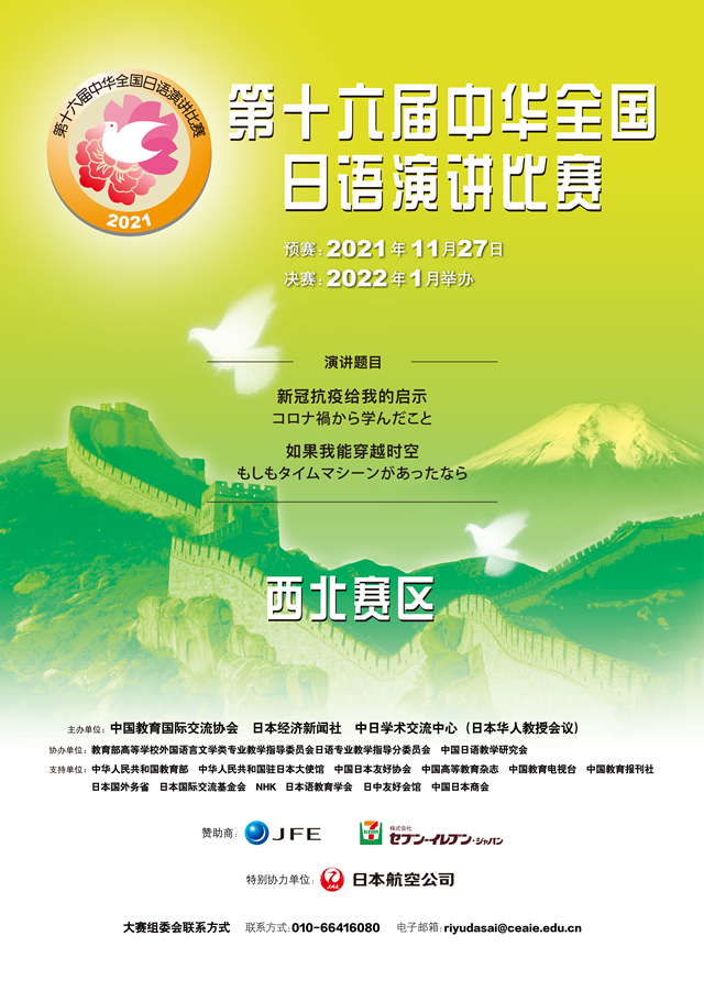 2021年11月27日,由中国教育国际交流协会、日本经济新闻社、中日学术交流中心(日本华人教授会议)联合主办,教育部高等学校外国语言文学类专业教学指导委员会日语专业教学指导分委员会 、中国日语教学研究会协办,西安外国语大学承办的第十六届中华全国日语演讲比赛西北赛区预赛于西安外国语大学长安校区JA111报告厅成功举办。本届比赛也得到了我国驻日本大使馆、中国日本友好协会、日本国文部科学省、日本国外务省、日本国际交流基金、NHK等机构的大力支持。