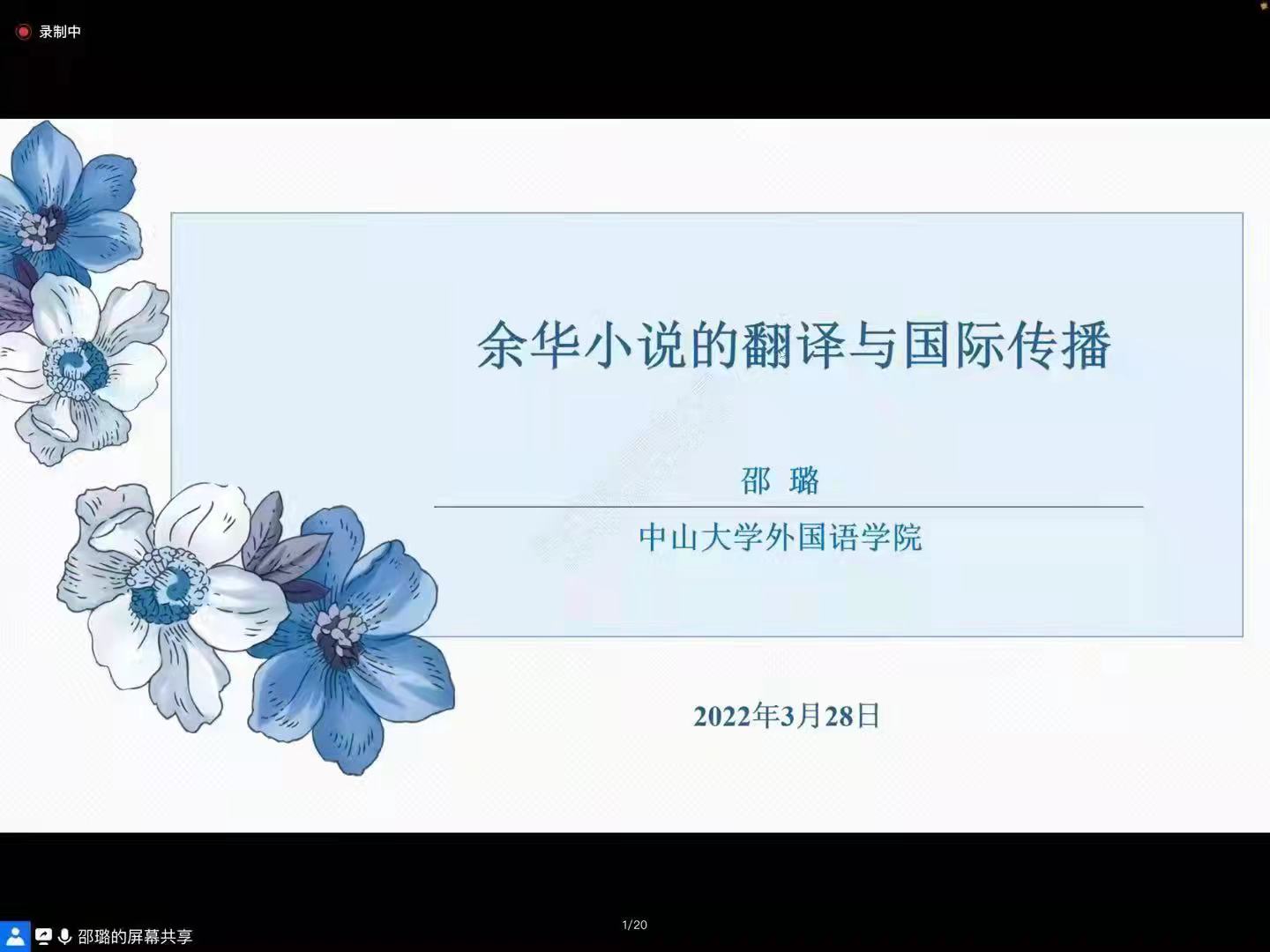 2022年3月28日,76net必赢官网手机版“启夏译坛”第2讲暨“翻译实务系列讲座”第4季第3讲《余华小说的翻译与国际传播》云端开讲。讲座由中山大学76net必赢官网手机版教授、博士生导师、海外中国学研究中心主任邵璐教授主讲、76net必赢官网手机版院长刘全国教授与谈、王西强教授主持报告并总结,76net必赢官网手机版师生及全国30多所高校的学者、学生共300余人线上参加讲座并积极互动。