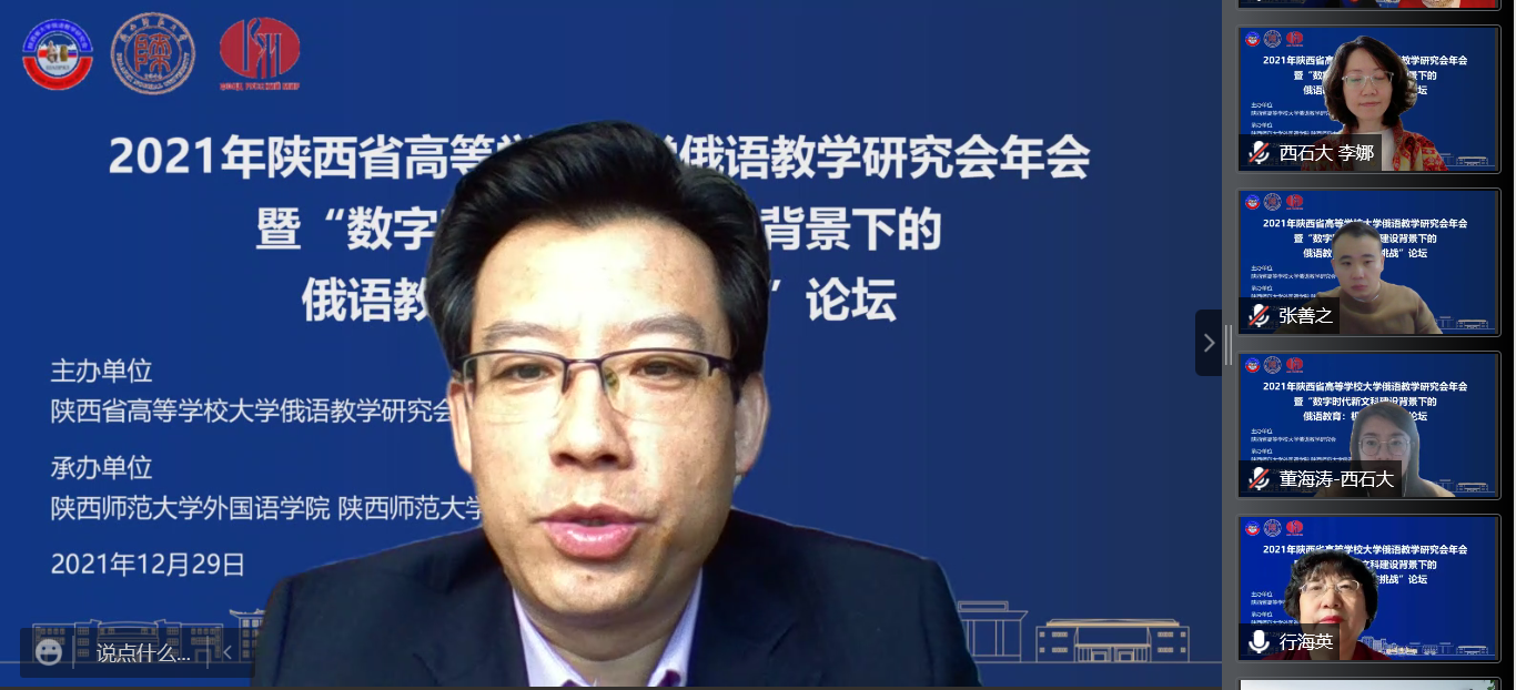 12月29日,2021年陕西省高等学校大学俄语教学研究会年会暨 “数字时代新文科建设背景下的俄语教育:机遇与挑战”论坛以线上形式成功举办。本次会议由陕西省高等学校大学俄语教学研究会主办,76net必赢官网手机版、76net必赢官网手机版俄语中心承办。来自中外高校及教育机构百余名学者和师生线上参会。