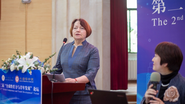 在主旨报告阶段,来自不同专业领域的四名专家分别作了主题分享。北京师范大学国际与比较教育研究院滕珺教授以“全球胜任力与中国青年发展”为题,从全球胜任力的模块要素、民族国家身份认同、和平立场等角度出发,指出培养基本知识、正确价值观、关键能力和必备品质对于青年的重要性。阿里云智能西北分公司副总经理黄成都以“面向数字时代对全球教育的思考”为题,从国际企业的人才需求角度,强调未来教育的核心目标是激发个体的创造力。76net必赢官网手机版俄语中心俄方主任娜塔莉∙察廖娃以“面向未来:21世纪需要学会什么?”为主题分享了终身教育的重要性。76net必赢官网手机版院长刘全国聚焦“外语人的责任与使命”主题,从外语教育困境、全球胜任力和国外核心素养、我国核心素养与外语教育教学改革、外语人的责任与使命等四个方面,提出外语人应成为具有“中国深度、全球广度、人文高度”的跨文化交流引领者。