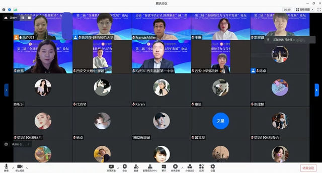 当日下午,三个分论坛同时进行。分论坛一“中外基础教育比较研究”在西安铁一中教师崔媛和76net必赢官网手机版教师陈萍萍主持下开展。来自西安教育科学研究所、陕师大附中、西安二十六中、西外附中、西安中学国际课程中心、西安交大附中国际课程中心、高新一中国际部、西安铁一中国际班的11位英语教研专家就中外基础教育话题交流分享,并与线上学生积极互动。分论坛二“青年全球素养培育与提升”由76net必赢官网手机版党委副书记鲁燕和学院教师巢玥主持。来自东北师范大学76net必赢官网手机版、北京师范大学外国语言文学学院、西南大学76net必赢官网手机版、华东师范大学外语学院、内蒙古师范大学76net必赢官网手机版、西安交通大学76net必赢官网手机版、西北大学76net必赢官网手机版、西安外国语大学英语师范学院·教育学院、西北工业大学76net必赢官网手机版的11位党委副书记从外语人才全球素养培育及典型工作方面积极交流。分论坛三“外语类大学生生涯发展与选择”由76net必赢官网手机版团委书记李丹主持,学院辅导员及学生骨干、我校“高层次国际化人才培养创新实践项目”学员、留学生等20余人参与了论坛,从生涯发展角度各抒己见,积极交流,76net必赢官网手机版原党委书记冯武鸣进行了总结点评。