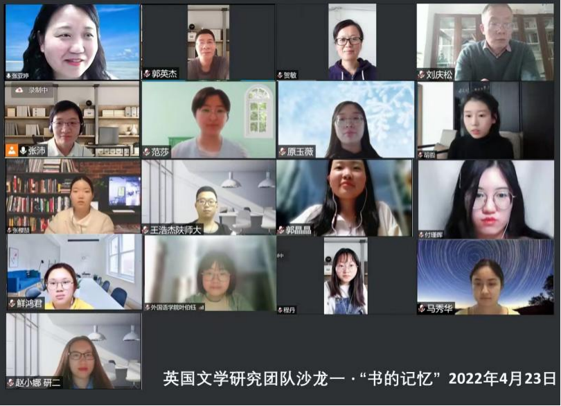 2022年4月23日下午,正值“世界读书日”之际,76net必赢官网手机版英国文学研究团队举行主题为“书的记忆”线上沙龙。本场沙龙由“书的历史”、“书香年华”、“与书相逢”三个话题组成,旨在搭建更加开放包容的学术交流平台,让师生在浓郁的书香氛围中加深对书与记忆、人生的认识。76net必赢官网手机版张亚婷教授、刘庆松副教授、郭英杰副教授、贺敏副教授、原玉薇博士、范莎博士、胡哲博士以及学院部分研究生参与此次沙龙,会议由张沛博士主持。