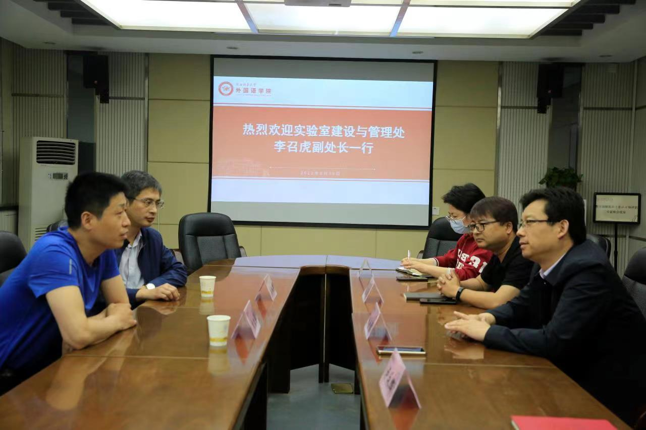 2022年5月10日下午,实验室建设与管理处副处长李召虎、实验室建设科科长张丽军一行莅临学院调研。学院院长刘全国、副院长王幸生、院办主任陈斐及语言语音教学中心卢永辉参加会议。