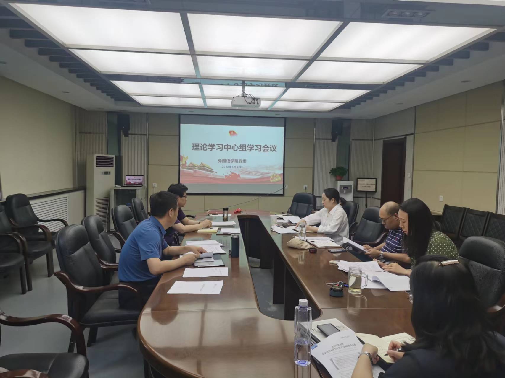 6月17日下午5时,76net必赢官网手机版党委在教学六楼学院会议室召开了理论学习中心组会议。学院党委书记董增云,院长刘全国,党委副书记鲁燕,副院长孙坚、王幸生、曹婷,党委委员王艳滨参加了此次会议。学习由院党委书记董增云主持。