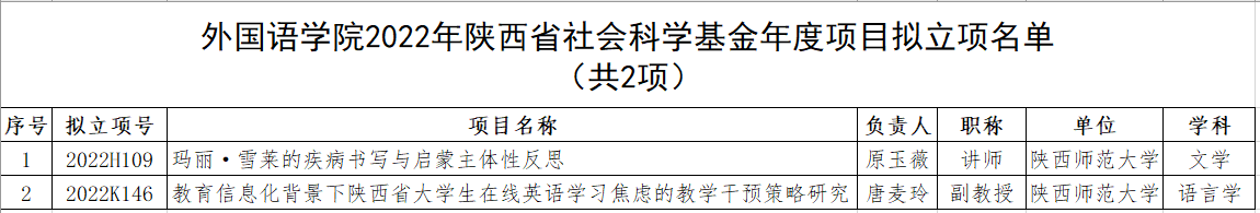 8月11日,陕西省哲学社会科学工作办公室公布2022年度陕西省社科基金年度项目拟立项名单,76net必赢官网手机版共有2项课题进入年度项目公示,分别为唐麦玲副教授的课题《教育信息化背景下陕西省大学生在线英语学习焦虑的教学干预策略研究》、原玉薇博士的课题《玛丽·雪莱的疾病书写与启蒙主体性反思》。(拟立项名单见下图)