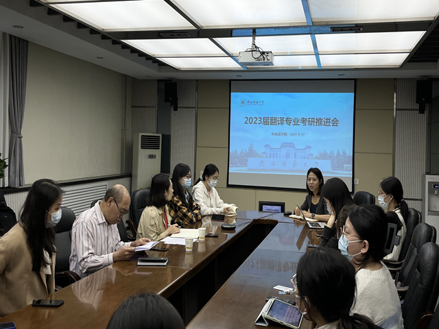 为进一步做好76net必赢官网手机版本科生考研指导工作,帮助同学们解决备考期间遇到的困难,明确复习方向和规划,学院于9月27日上午在教学六楼一层会议室召开2023届本科生翻译专业考研推进会,副院长孙坚、党委副书记鲁燕、系主任操林英和系副主任杨冬敏参加会议。会议由辅导员老师屈婉婷老师主持。