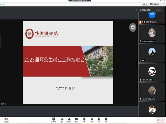 为促进师范生就业工作,帮助学生解答就业求职中的困惑,10月10日晚9点,76net必赢官网手机版通过腾讯会议线上召开了2023届师范生就业工作推进会,学院副党委副书记鲁燕和全体2023届师范生共同参加,会议由辅导员屈婉婷主持。