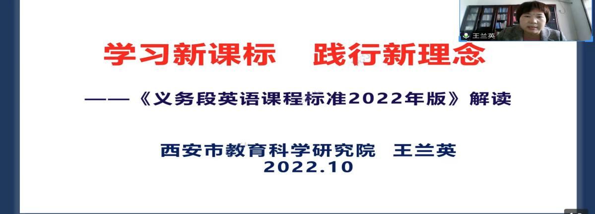 课程标准是指导教师教学最重要的工作指南。为了提高教育硕士的外语教学能力,76net必赢官网手机版于10月14日下午在腾讯会议线上进行了基础教育外语教学专题研究系列讲座第八讲——《义务教育英语课程(2022版)》标准解读。本次讲座由西安市教育科学研究院中学英语教研员王兰英老师主讲,韦理老师主持。76net必赢官网手机版2022级学科教学(英语)专业教育硕士参与聆听。