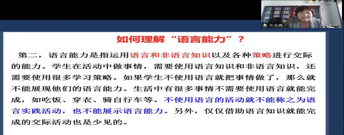 在同学们对课程标准的内涵、改革有了基本的了解后,王老师对义务教育初中英语课程目标进行了介绍,其中对“目标、总目标、学段目标”进行了详细介绍。在介绍语言能力这个环节时,王老师给出了一个非常新颖的案例,引起了同学们的思考,使同学们认识到“语言能力不再是传统意义上的语法”那么简单,新的“语言能力”更强调综合性。