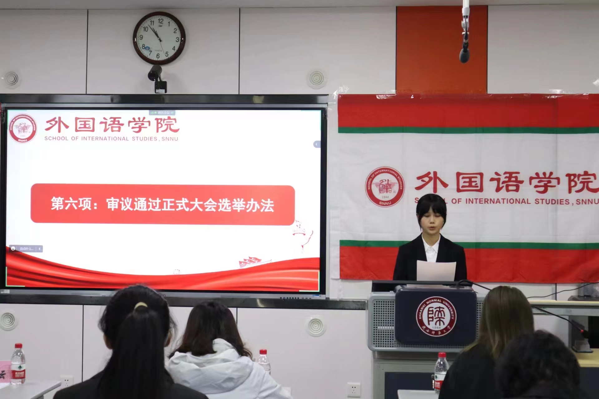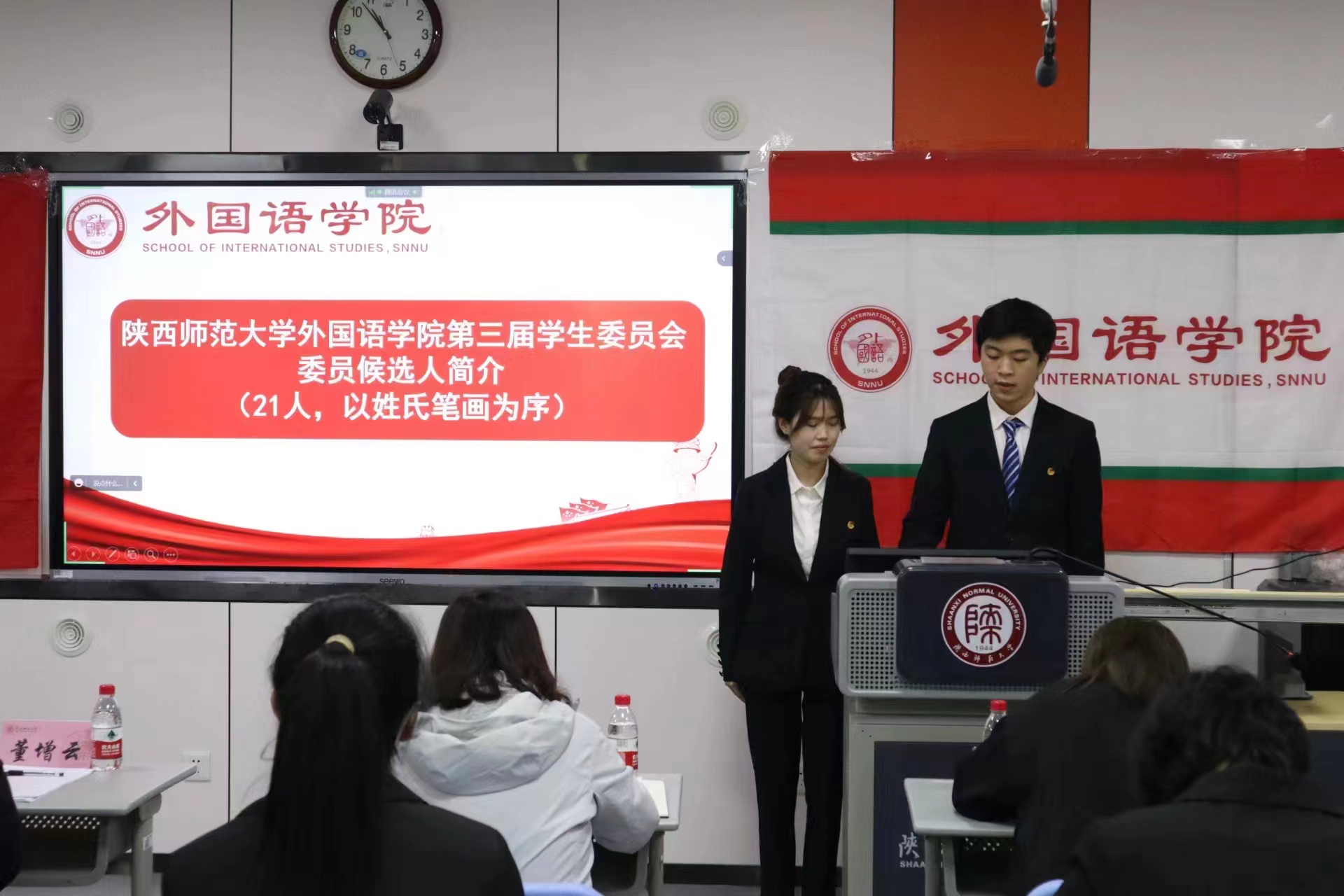 会议选举产生了王路峣、刘芳菲、孙晓雯同学为第三届学生委员会主席团成员,马曦、关棋、靳燕琪同学为第三届研究生委员会主席团成员;选举王路峣为第三届学生委员会执行主席;选举马曦为第三届研究生委员会执行主席;审议通过李丹同志为第三届学生(研究生)委员会秘书长。